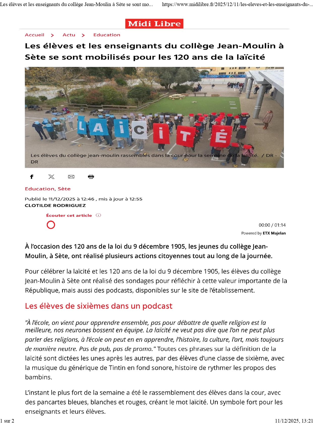 Pour célébrer les 120 ans de la loi du 9 décembre 1905, le collège Jean Moulin a mobilisé élèves et enseignants autour de plusieurs actions citoyennes.